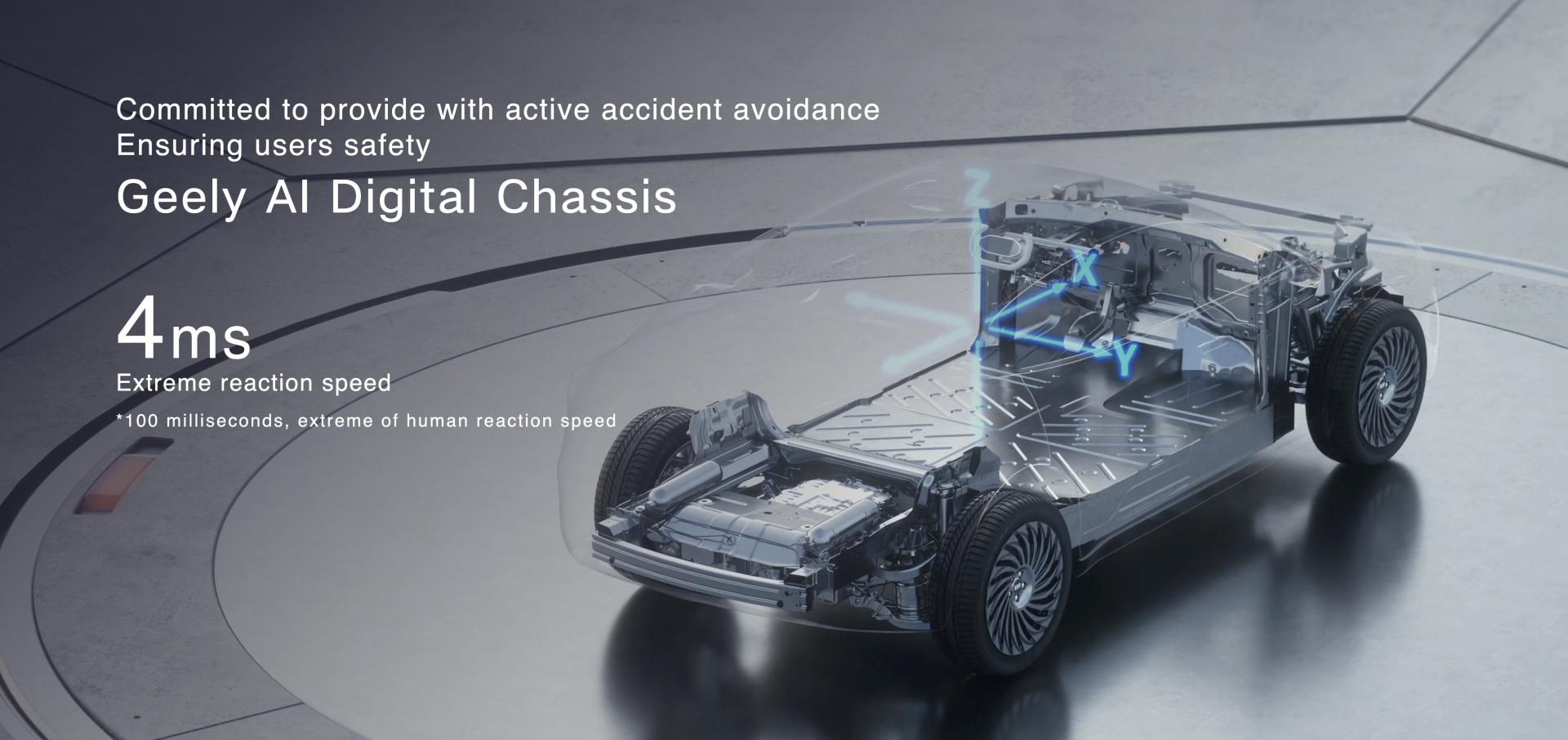 Geely's self-developed AI digital chassis highlights the integration of its proprietary chassis technology, intelligence, electrification, and large-scale AI models across multiple domains, demonstrating industry-leading autonomous driving and active safety capabilities. This integration of the AI large model with a digital chassis allows Geely vehicles to perform the world's first autonomous drift, enhancing intelligent safety assistance for users. The Geely AI digital chassis reacts in just 4 milliseconds, 25 times faster than the fastest human reaction, enabling "automatic evasive maneuvers" under extreme conditions and providing users with proactive accident prevention and control security.
